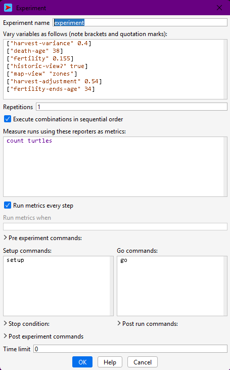 In BehaviorSpace, this is done by increasing the Repetitions value. Each repetition represents a different random realisation of the same underlying assumptions. In archaeological terms, this can be interpreted as exploring multiple plausible histories consistent with the same environmental and behavioural constraints.